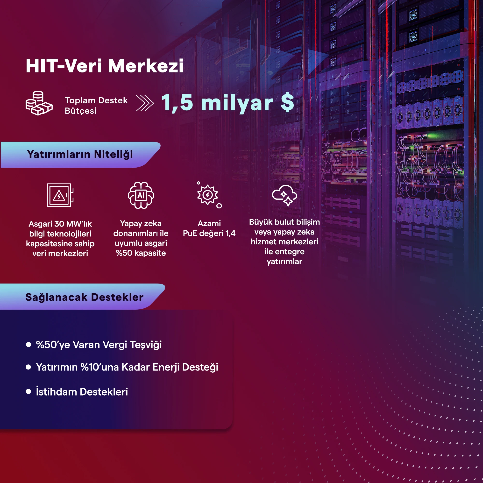 HIT-Veri Merkezi çağrısı ile amaçlanan; Türkiye’nin artan veri altyapısı ihtiyacını sadece kısa vadeli olarak karşılamak değil, aynı zamanda yapay zekâ ve geleceğin dijital teknolojilerinin gereksinimlerini karşılayabilecek nitelikteki veri merkezi kapasitesini uzun vadede de garanti altına almaktır.